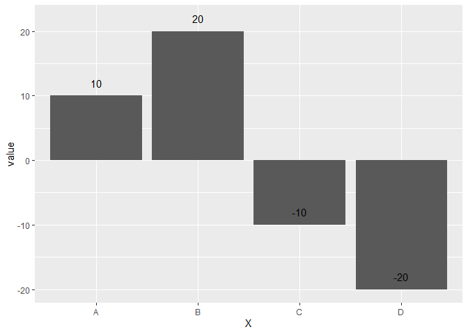 df <- data.frame(X = c("A", "B", "C", "D"), value = c(10, 20, -10, -20)) ggplot(df, aes(x = X, y = value)) + geom_col()